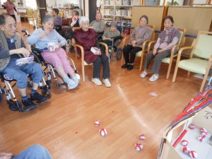 その後のレクリエーションでは、段ボールの鬼にむかって新聞ボールを投げ入れて頂きました。